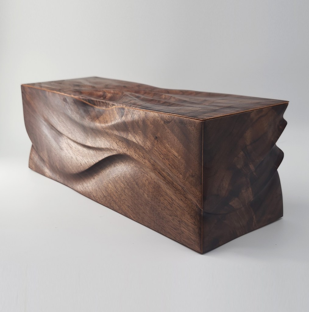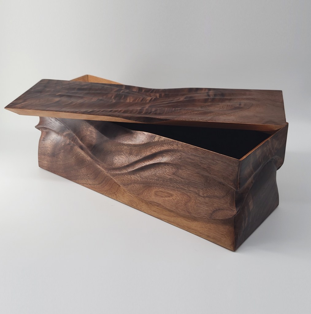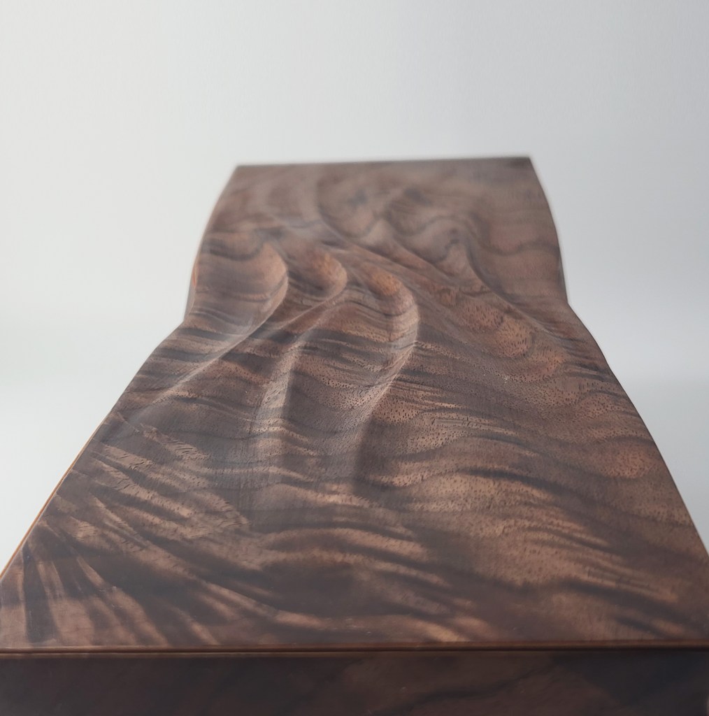 Flames features a walnut exterior with cherry inlay on the miters. The lid is easily removed with handles carved seamlessly in to the details. SOLD