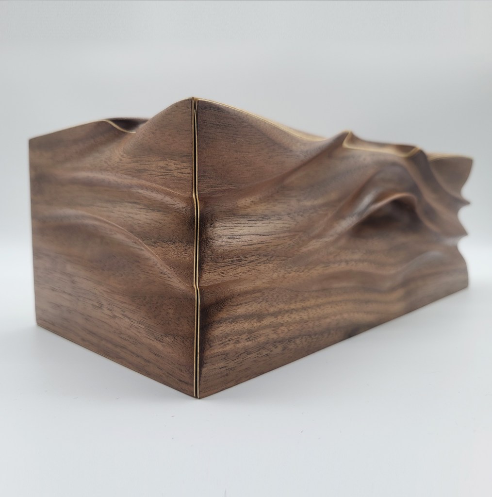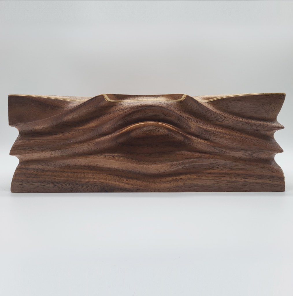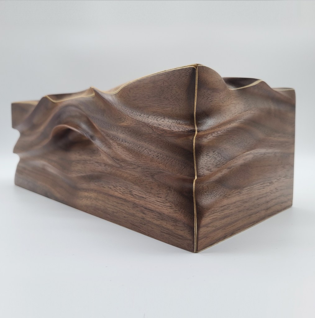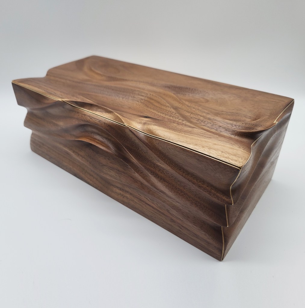 Walnut exterior with maple interior and inlay. The Slider features sleek curves with a stylishly disguised handle for the sliding drawer. SOLD