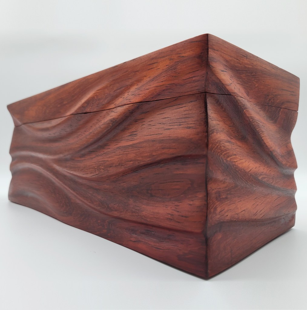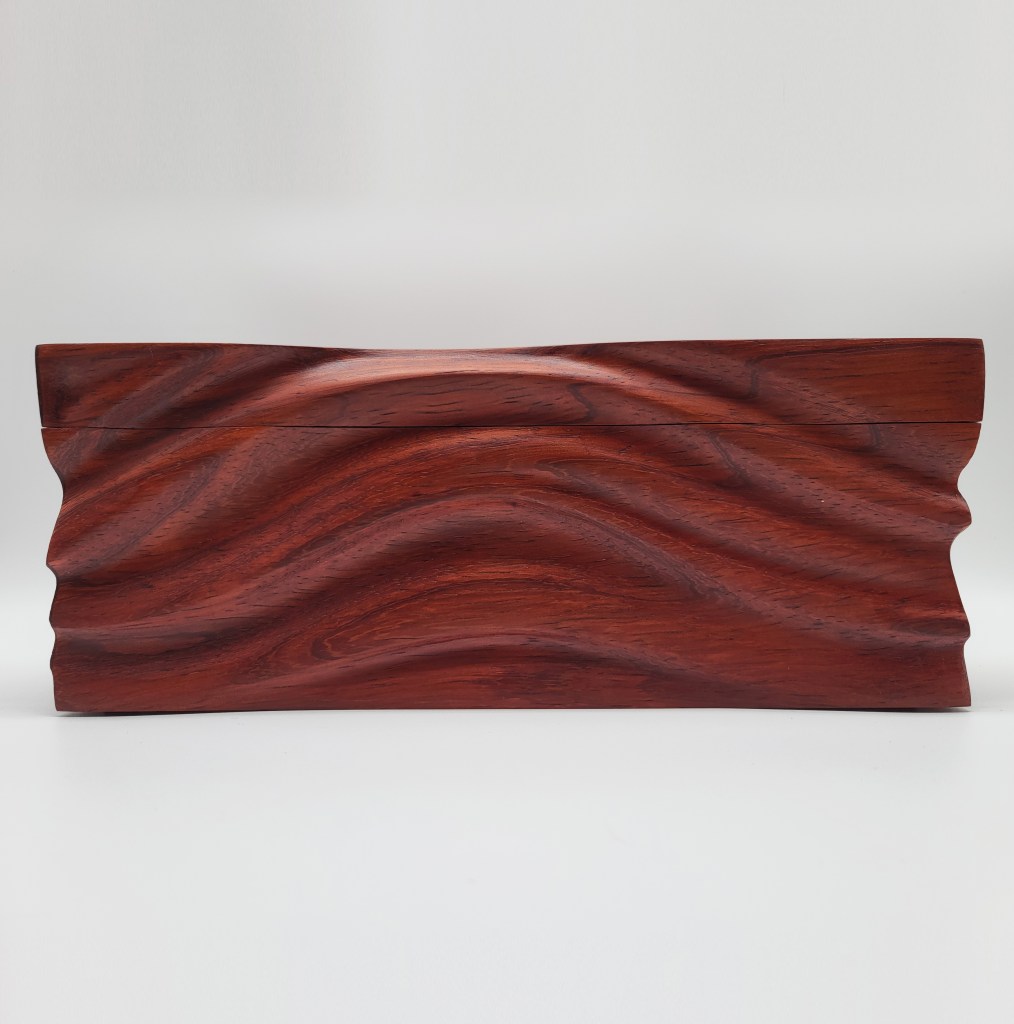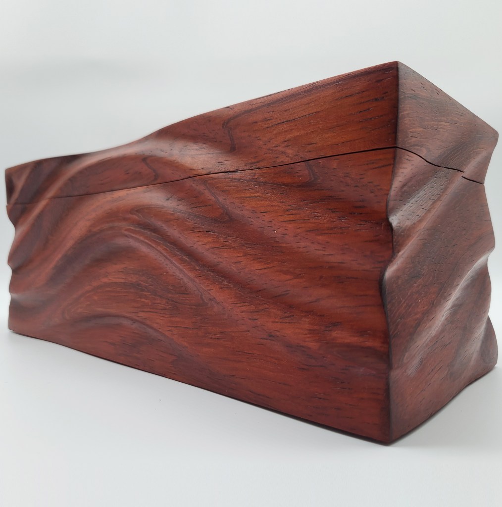 Made from solid padauk. Top Down has a classic lift-off style lid with a twist! The neck is inverted; built into the lid of the box rather than the body. SOLD
